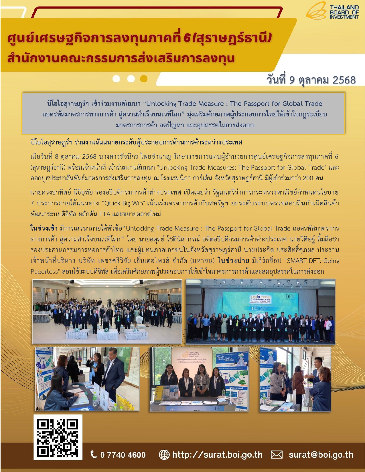 บีโอไอสุราษฎร์ฯ เข้าร่วมงานสัมมนา “Unlocking Trade Measure : The Passport for Global Trade ถอดรหัสมาตรการทางการค้า สู่ความสำเร็จบนเวทีโลก” มุ่งเสริมศักยภาพผู้ประกอบการไทยให้เข้าใจกฎระเบียบ มาตรการการค้า ลดปัญหา และอุปสรรคในการส่งออก
