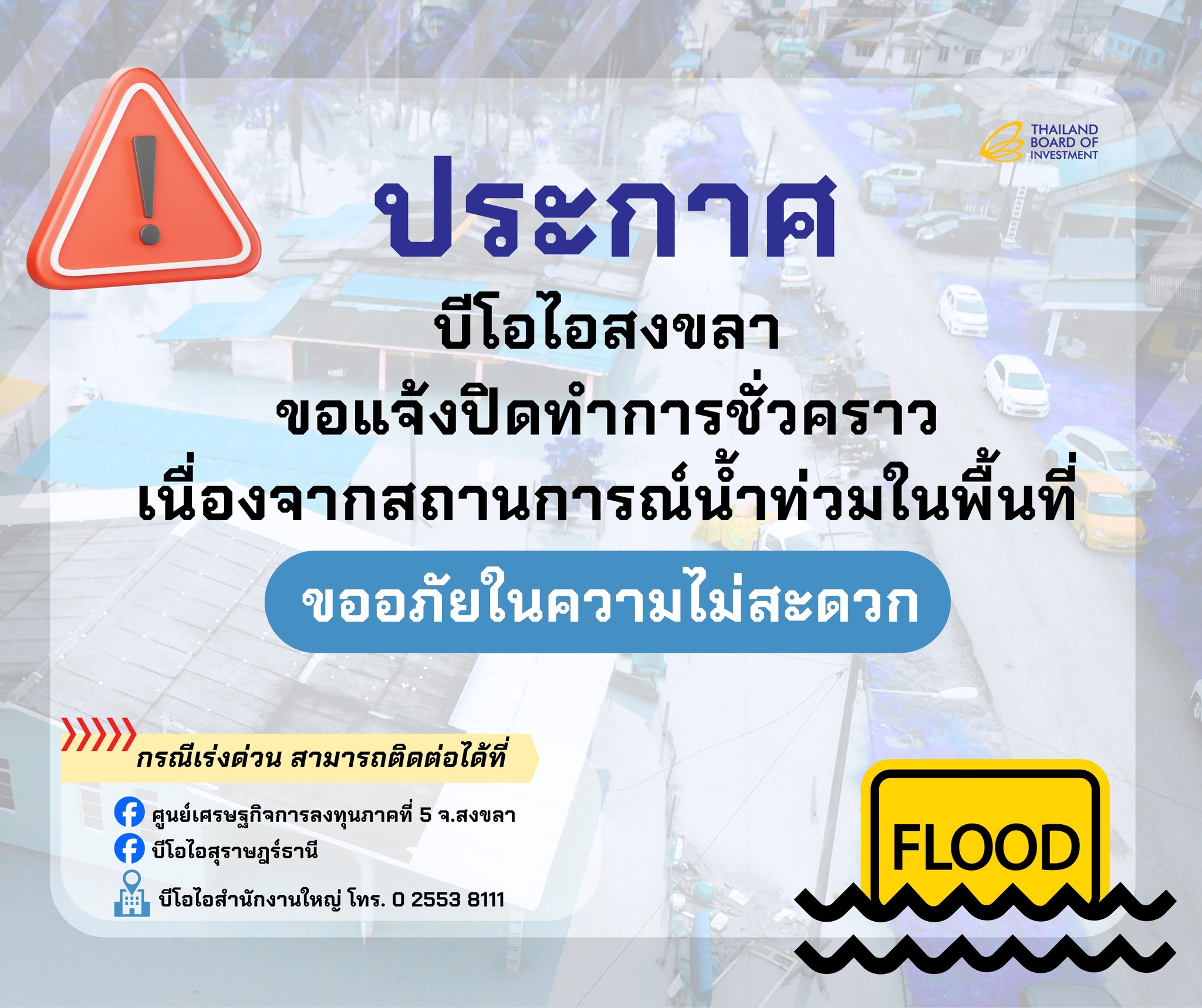 เนื่องจากสถานการณ์น้ำท่วมในพื้นที่ ศูนย์เศรษฐกิจการลงทุนภาคที่ 5 (บีโอไอสงขลา) ศูนย์เศรษฐกิจการลงทุนภาคที่ 5 จ.สงขลา ปิดทำการชั่วคราวกรณีเร่งด่วน สามารถติดต่อได้ที่ บีโอไอ สุราษฎร์ธานี หรือบีโอไอสำนักงานใหญ่ กรุงเทพฯ ในทุกช่องทาง บีโอไอพร้อมช่วยเหลือผู้ประกอบการที่ได้รับผลกระทบ ด้วยมาตรการช่วยเหลือผู้ได้รับการส่งเสริมการลงทุนที่ได้รับผลกระทบจากอุทกภัยเพื่อบรรเทาความเดือดร้อนและสนับสนุนให้ธุรกิจกลับมาฟื้นตัวสู่ภาวะปกติได้โดยเร็วที่สุด ผ่านการลดภาระภาษีและอำนวยความสะดวกในการนำเข้าเครื่องจักรทดแทน