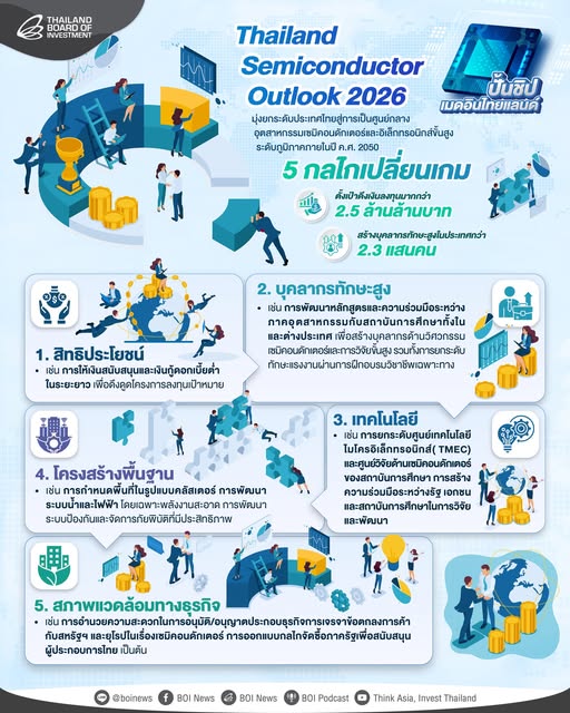 เมื่อประเทศไทยวาง “โรดแมปเซมิคอนดักเตอร์แห่งชาติ” นี่ไม่ใช่แค่แผนงานทั่วไปแต่คือเดิมพันครั้งสำคัญที่จะเปลี่ยนไทยจาก “ผู้ประกอบ” สู่ “ผู้ผลิต” ภายใต้วิสัยทัศน์ “ชิปเมดอินไทยแลนด์ (Made-in-Thailand Chips)” ภายในปี 2050 ด้วยเป้าหมายดึงดูดเม็ดเงินลงทุนมหาศาลกว่า 2.5 ล้านล้านบาท และสร้างกองทัพบุคลากรทักษะสูงกว่า 230,000 คน บีโอไอขอพาคุณไปแกะรหัสความสำเร็จผ่าน "5 กลไกขับเคลื่อน" ที่จะดันไทยขึ้นแท่นผู้นำอุตสาหกรรมชิปในภูมิภาค โฟกัสจุดแข็ง แข่งในเกมที่เราชนะจากการศึกษาเชิงลึกร่วมกับบริษัทที่ปรึกษาระดับโลกอย่าง Roland Berger พบว่า แม้อุตสาหกรรมต้นน้ำของไทยจะอยู่ในช่วงเริ่มต้นแต่เรามีศักยภาพสูงใน 5 กลุ่มผลิตภัณฑ์หลัก ได้แก่ Power, Sensor, Photonics, Analog และ Discrete ซึ่งเป็นหัวใจของเทรนด์โลกอย่าง ยานยนต์ อิเล็กทรอนิกส์ โทรคมนาคม ดาต้าเซ็นเตอร์ เทคโนโลยี AI ระบบออโตเมชั่น และการแพทย์ ยุทธศาสตร์ระยะ 5 ปีแรกจึงมุ่งเน้นต่อยอดจุดแข็งเดิม เช่น กิจการประกอบและทดสอบชิป (Outsourced Semiconductor Assembly and Test: OSAT) การออกแบบชิป (IC Design) และกลุ่มผลิตภัณฑ์อิเล็กทรอนิกส์ขั้นสูง ควบคู่กับการผลักดันให้เกิดการลงทุนผลิตชิปต้นน้ำ (Wafer Fabrication) และปั้นผู้ประกอบการไทยให้เป็น Local Champion