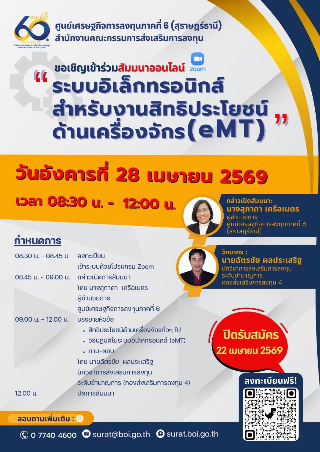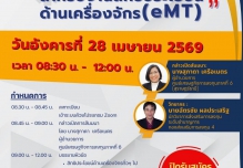 ขอเชิญเข้าร่วมสัมมนาออนไลน์ “ระบบอิเล็กทรอนิกส์สำหรับงานสิทธิประโยชน์ด้านเครื่องจักร (eMT)” ในวันอังคารที่ 28 เมษายน 2569 เวลา 08.30-12.00 น.