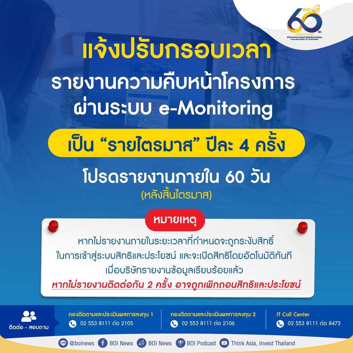 บีโอไอแจ้งปรับกรอบเวลาการรายงานความคืบหน้าโครงการผ่านระบบ e-Monitoring